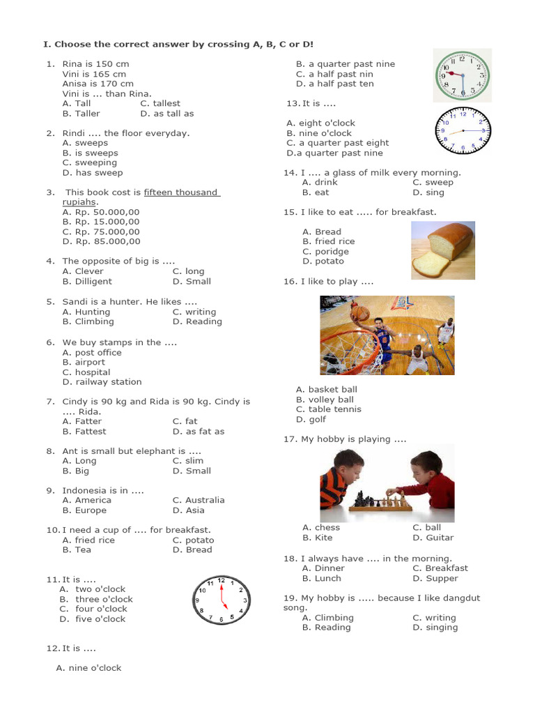 Soal UKK Bahasa Inggris SD kelas 3 biasanya bervariasi untuk menguji berbagai aspek kemampuan siswa. Tipe-tipe soal yang umum meliputi:
